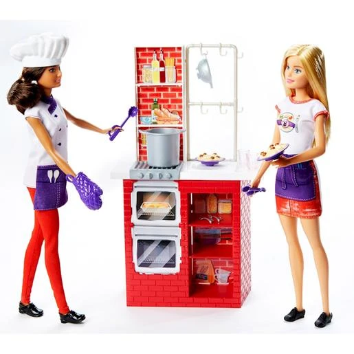 La muñeca chef está lista para completar pedidos con un atuendo profesional con sombrero y manoplas para horno; la muñeca camarera, con vestido con delantal, puede servir los platos.