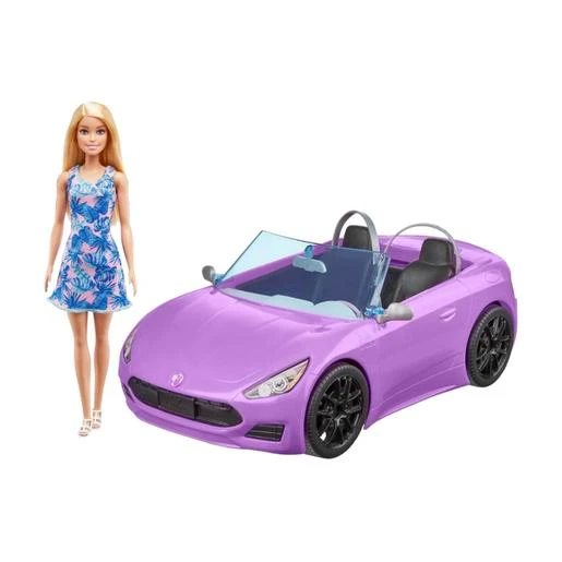 Emprende el camino hacia la diversión imaginando y recreando tus propias historias con la muñeca Barbie y su vehículo descapotable morado.