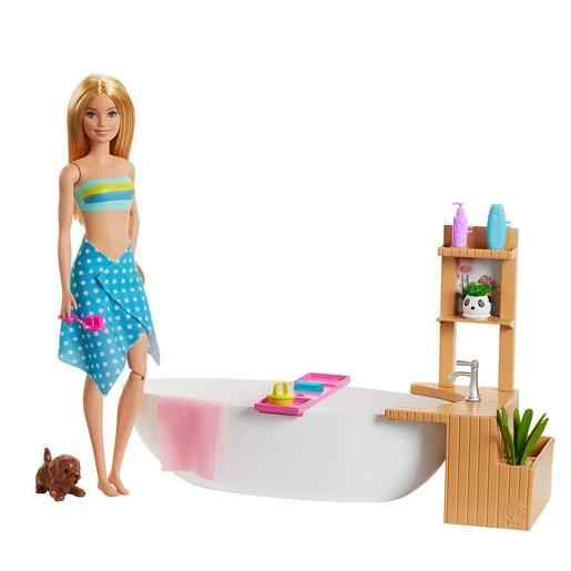 La muñeca Barbie, articulada, con un traje de baño y una toalla, viene con un cachorro, una bañera de hidromasaje y accesorios para jugar con un verdadero baño de espuma.