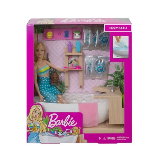 Barbie – Muñeca y Bañera de Burbujas, una muñeca Barbie con su perrito y un baño muy completo con todo lo necesario para un relajante baño de burbujas.
