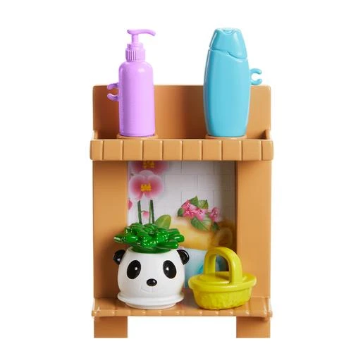 Para que sea una experiencia más real y completa, usa los accesorios: los productos de baño, la esponja vegetal, un cepillo para la espalda y la toalla. Algunas piezas tienen un asa que Barbie pueda sostenerlos.