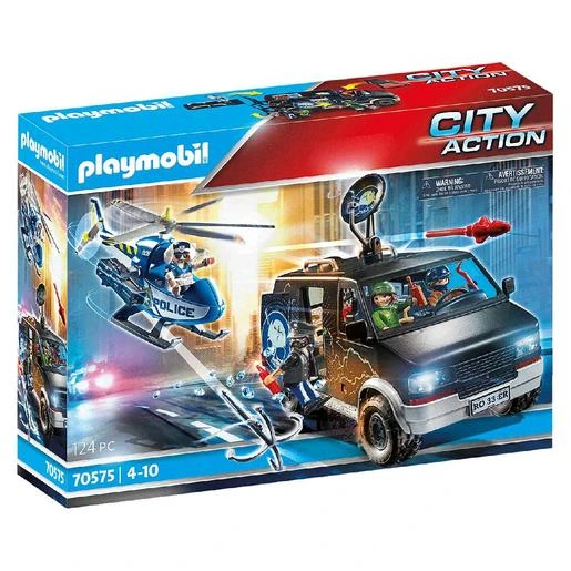 Playmobil – Helicóptero de policía: persecución del vehículo huido – 70575, un playset en el que tres gánster van a cometer el robo de joyas perfecto.