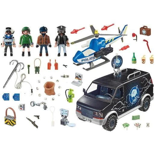 El set contiene 4 figuras de Playmobil, 1 helicóptero con un gancho, 1 camioneta con antena satélite, 1 estación de trabajo con ordenador y mucho más.